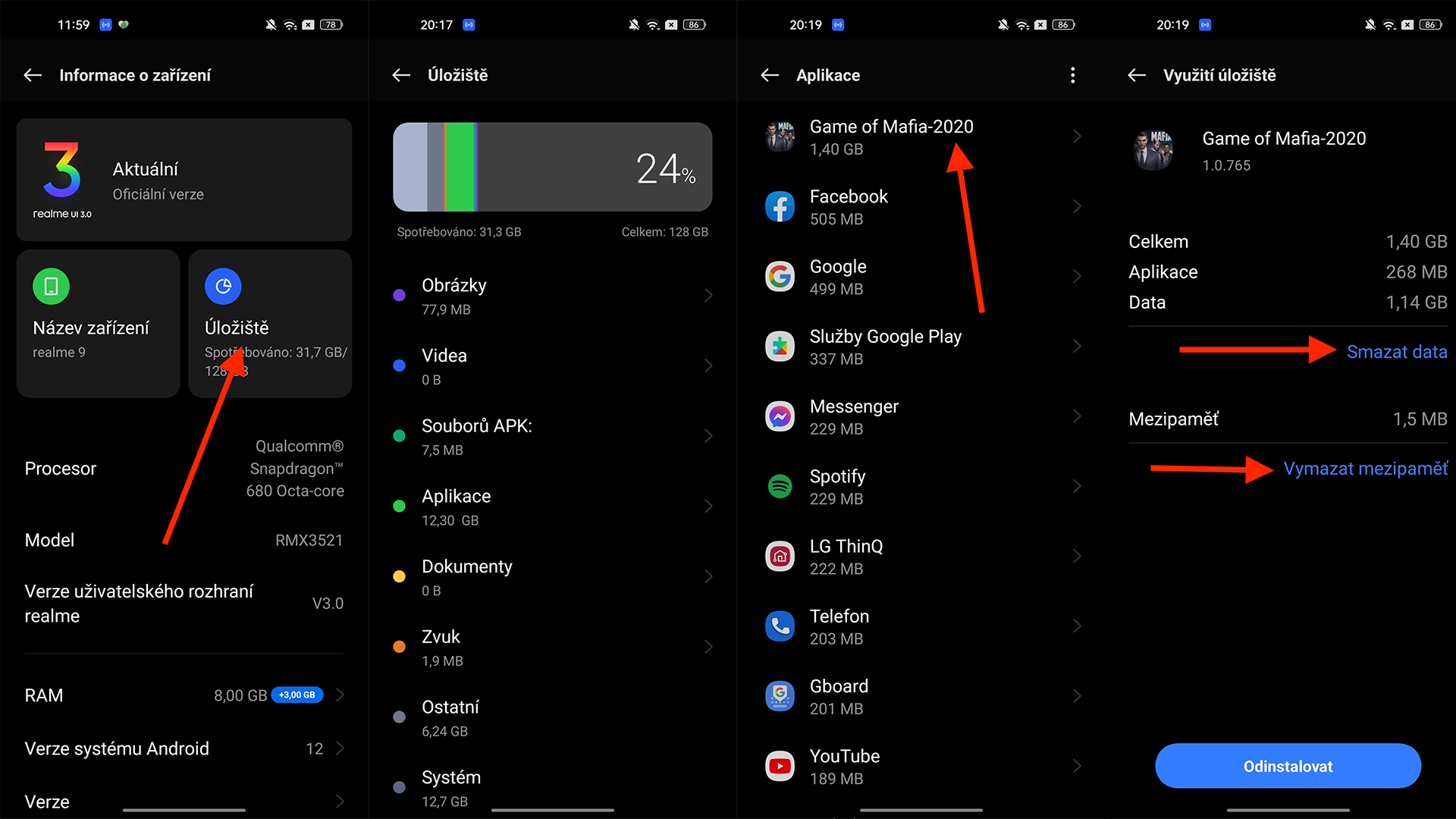 Informace o zařízení> Úložiště> Je posléze na vás, zda si rozkliknete konkrétní aplikaci nebo vyberete Obrázky. Všimněte si, že telefon sám uvádí, kolik paměti jste v dané rubrice zaplnili. Já jsem si vybrala hru Game of Mafia, kterou poslední dobou moc nehraji. Klikla jsem na ni a vidíte, že si mohu zvolit mezi Smazat data nebo Smazat cache.