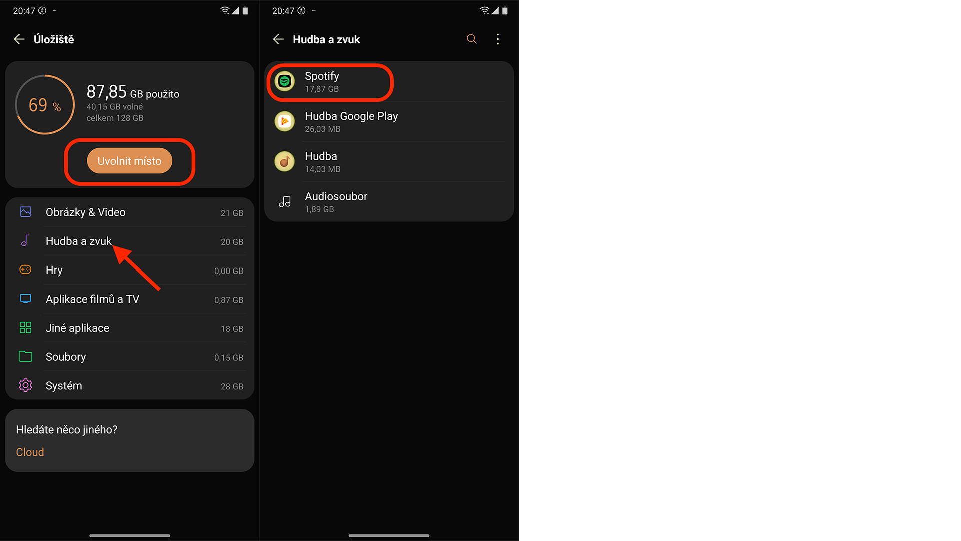 Na dalším screenshotu vidíte, že některé telefony ve vašem Úložišti nabízejí možnost „Uvolnit místo“ (Opět se název může lišit podle značky telefonu) – to znamená, že sám systém najde přebytečná data a zbaví se jich. Máte-li tuto funkci k dispozici, určitě ji využijte! Je to mnohem jednodušší než procházet jednotlivá Multimédia, Stažené dokumenty atd.
