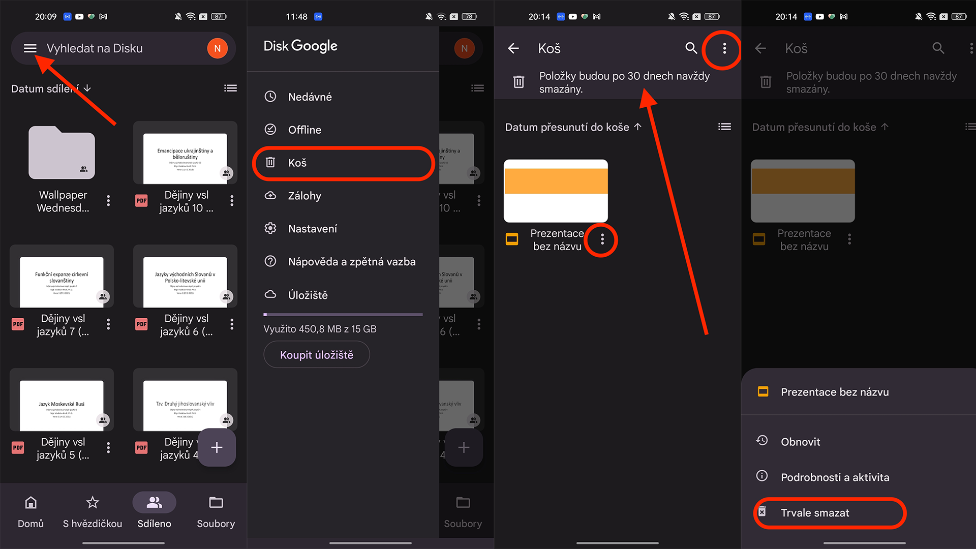 - Vidíte, že je zde uvedeno, že položky se smažou automaticky po 30 dnech, co jsou v Koši. Pokud ale nechcete čekat měsíc na jejich smazání, můžete si vybrat, na jaké tři tečky nad sebou kliknete. Pokud máte více souborů v koši, stačí kliknout na tři tečky u konkrétního souboru. Chcete-li smazat vše, můžete kliknout na 3 tečky v pravém horním rohu.