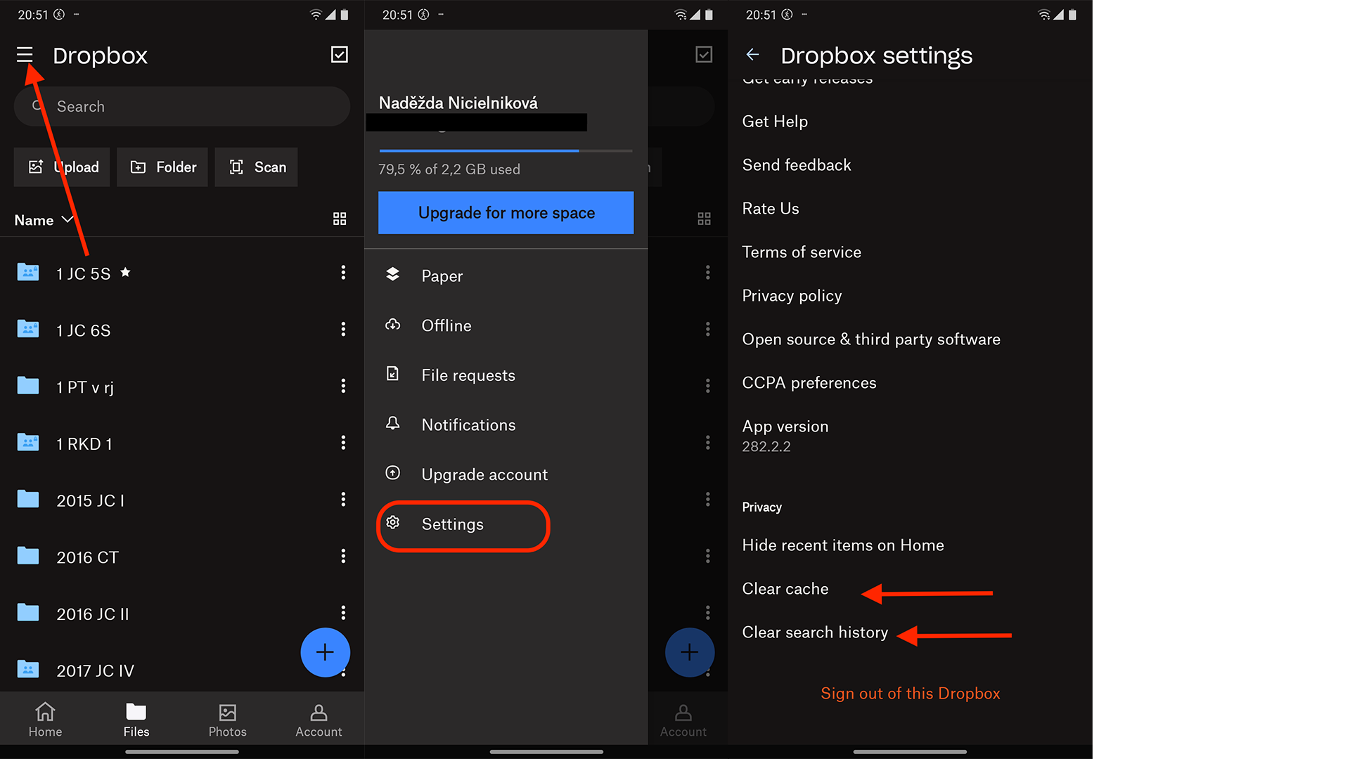 - Kliknete na Settings > a v Settings úplně dole máte nabídku: Clear cache, Clear search history. Obě varianty vám uvolní několik MB navíc, zároveň se nemusíte obávat, že byste nějaký vámi nahraný soubor ztratili.