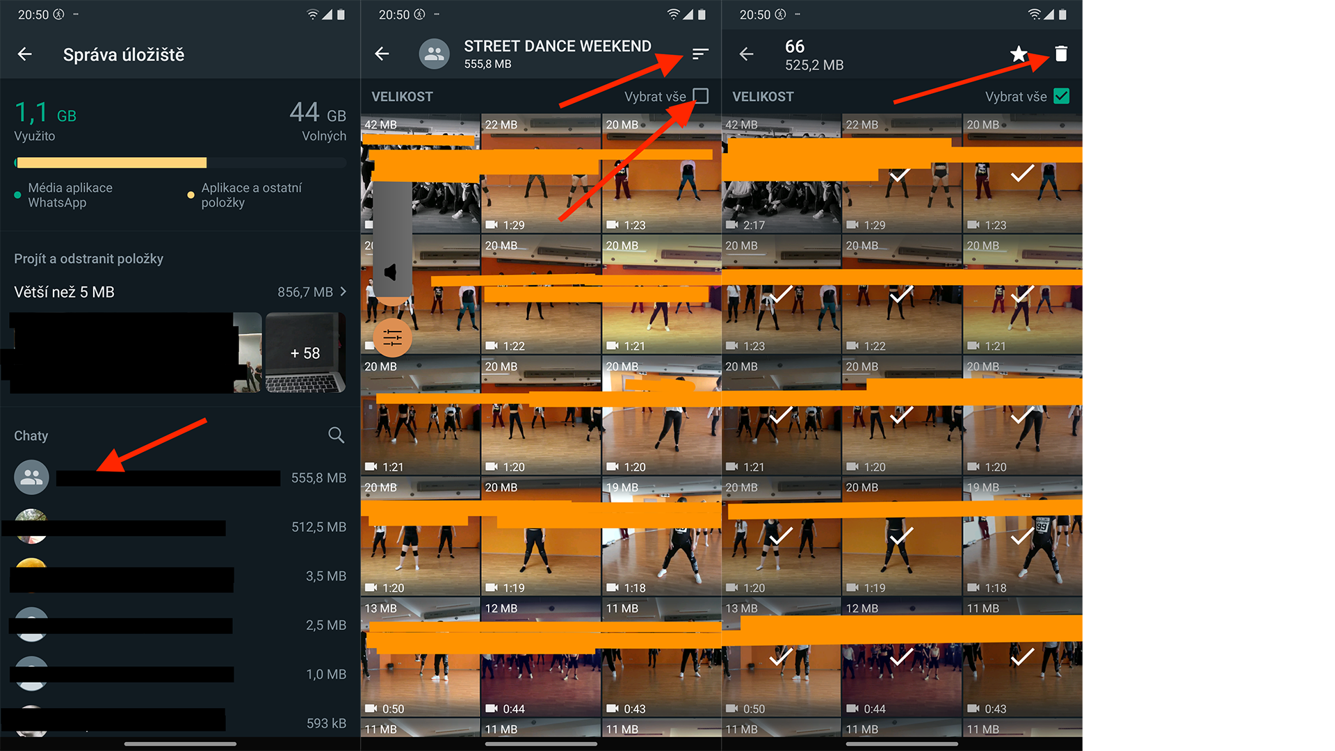 - Na screenshotu v konverzaci „Street dance weekend“ ukazuji červenou šipečkou opět do pravého horného rohu na tři čárky nad sebou (obrácený Adidas). Kde si buď zvolíte, kolik souborů chcete smazat, nebo pod čárečkami máte možnost Vybrat vše.