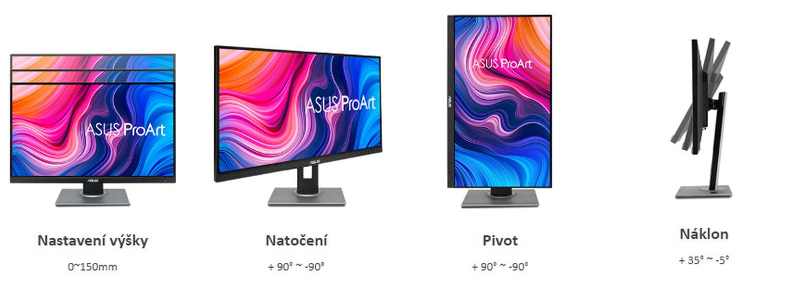 Díky ergonomicky navrženému stojanu s možností nastavení náklonu, natočení, otočení a výšky poskytují displeje ProArt pohodlné sledování a používání. Možnost otočit obrazovku o 90 stupňů ve směru či proti směru hodinových ručiček pro použití v režimu na výšku se hodí při práci s dlouhými dokumenty, kódování nebo prohlížení webových stránek. Rychloupínací stojan navíc usnadňuje připevnění monitoru pomocí integrovaného VESA držáku na stěnu bez šroubů, takže vše je připraveno během několika sekund!