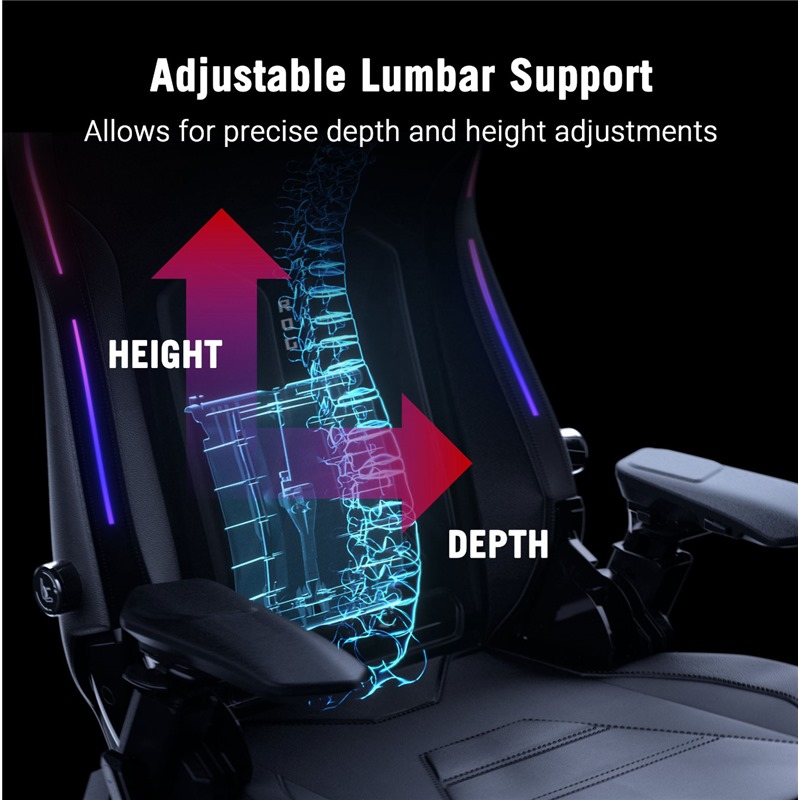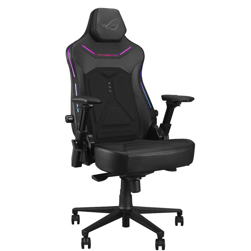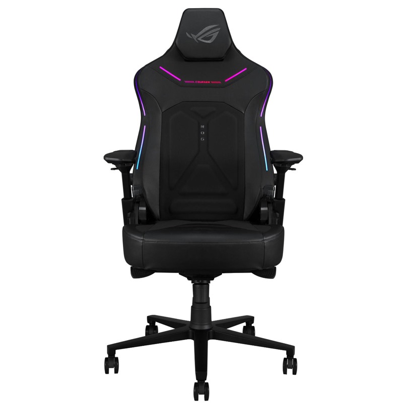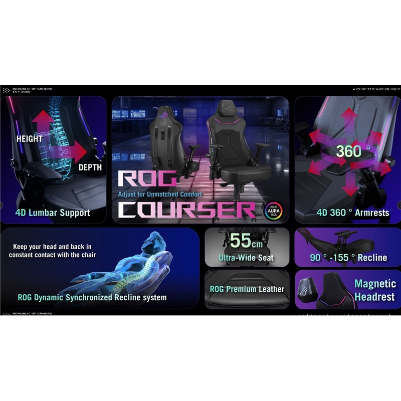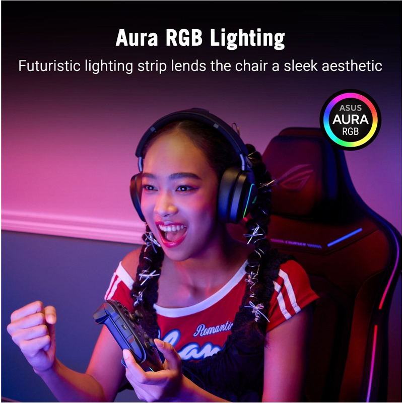 Skryté RGB světelné pásky zabudované do prémiového průhledného koženkového materiálu zobrazují až osm živých barev a nabízejí šest přednastavených efektů. I když jsou vypnuté, tyto skryté pásky podtrhují elegantní a prémiový vzhled židle. Zadní logo ROG je také vybaveno RGB osvětlením, jehož jas a efekty lze snadno ovládat pomocí tlačítek na zadní straně židle. Zapnutí je jednoduché – stačí připojit Courser k powerbance nebo notebooku přes USB-C®.