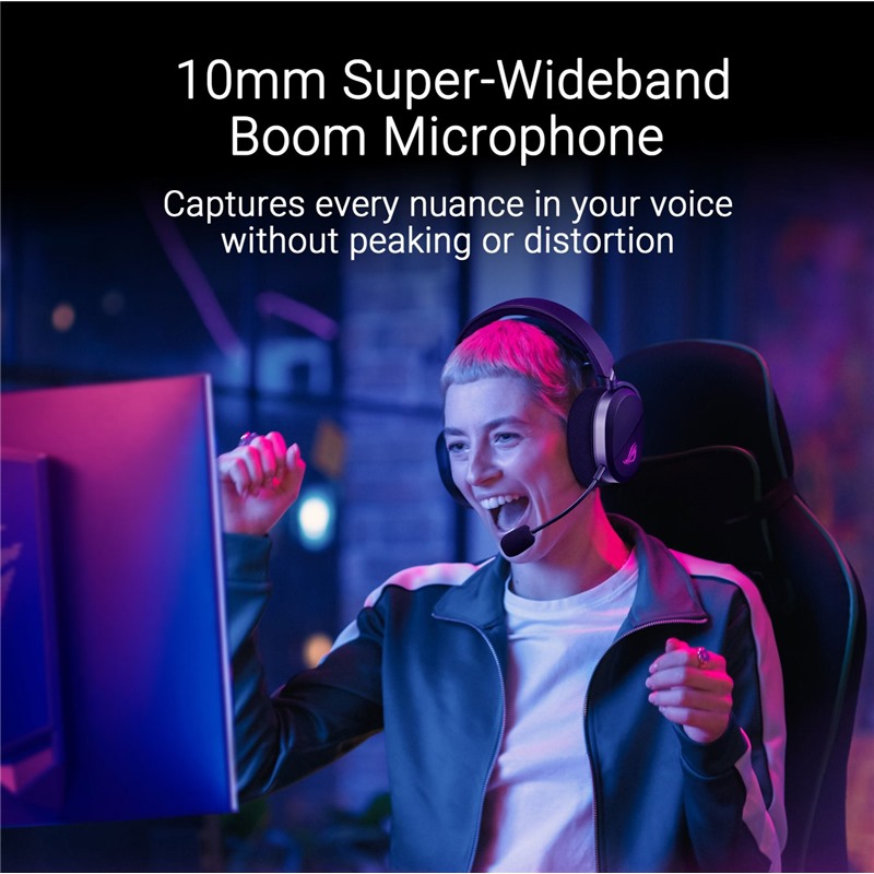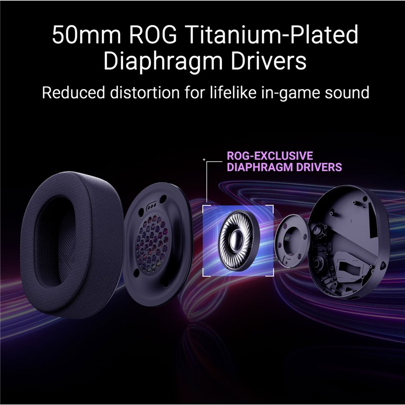 Exkluzivní 50mm měniče s titanovou membránou ROG poskytují akustický výkon s vysokým rozlišením, ostré a detailní výšky a snížené zkreslení pro realistický zvuk ve hře.