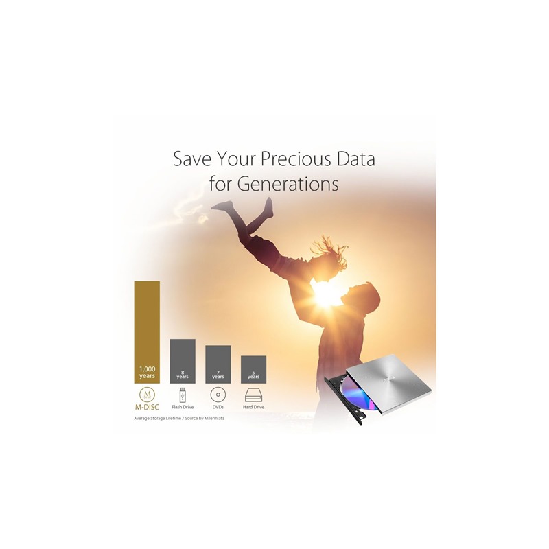 Externí vypalovačka ASUS SDRW-08U9M-U USB-C podporuje řešení pro ukládání archivních dat M-DISC, jež vám pomůže uchovat vaše nejcennější digitální vzpomínky jako jsou např. rodinné fotografie či videa. Životnost pevných disků, flashdisků či jiných zapisovatelných médií dosahuje přibližně 8 let, což není ideální doba pro archivaci. Ovšem technologie vypalování M-DISC zaznamenává data do pevné vrstvy, která je odolná vůči extrémním podmínkám a vaše data dokáže uchová po dobu více jak 1 000 let.