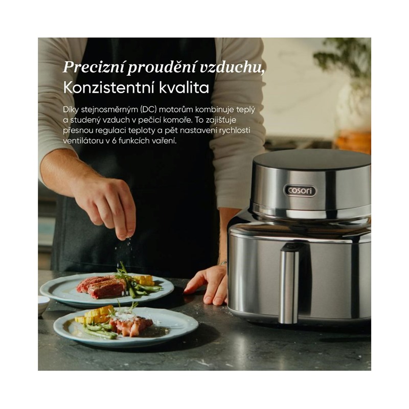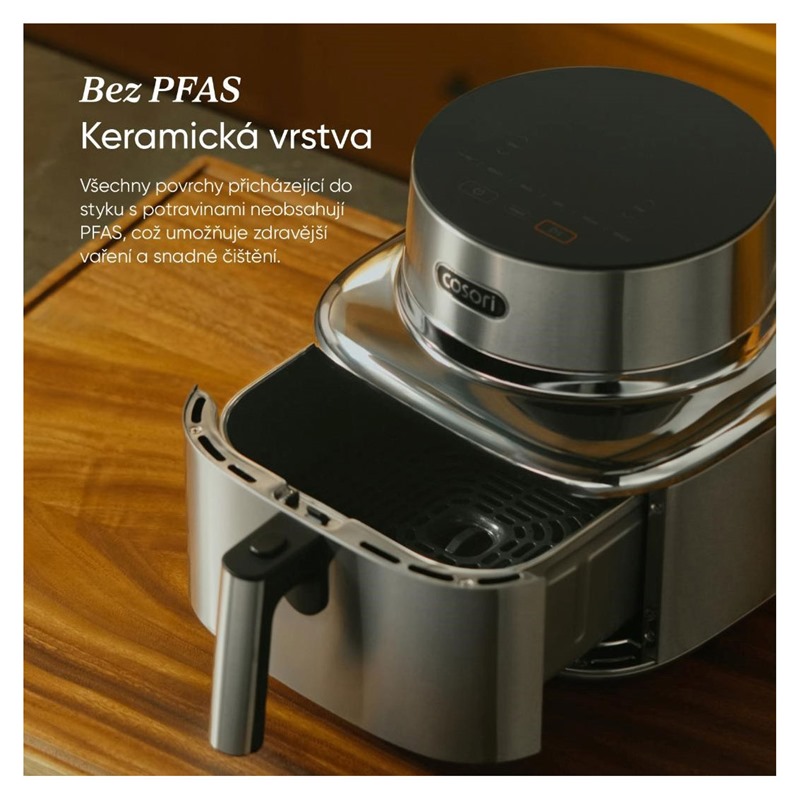 COSORI Iconic byl navržen jako přirozená součást moderního interiéru, ne jako obyčejný spotřebič. Nerezová ocel a tvrzené sklo vytvářejí čistý, klidný vzhled, který krásně zapadne do minimalistických kuchyní. Je to objekt, který potěší oko pokaždé, když kolem něj projdete.