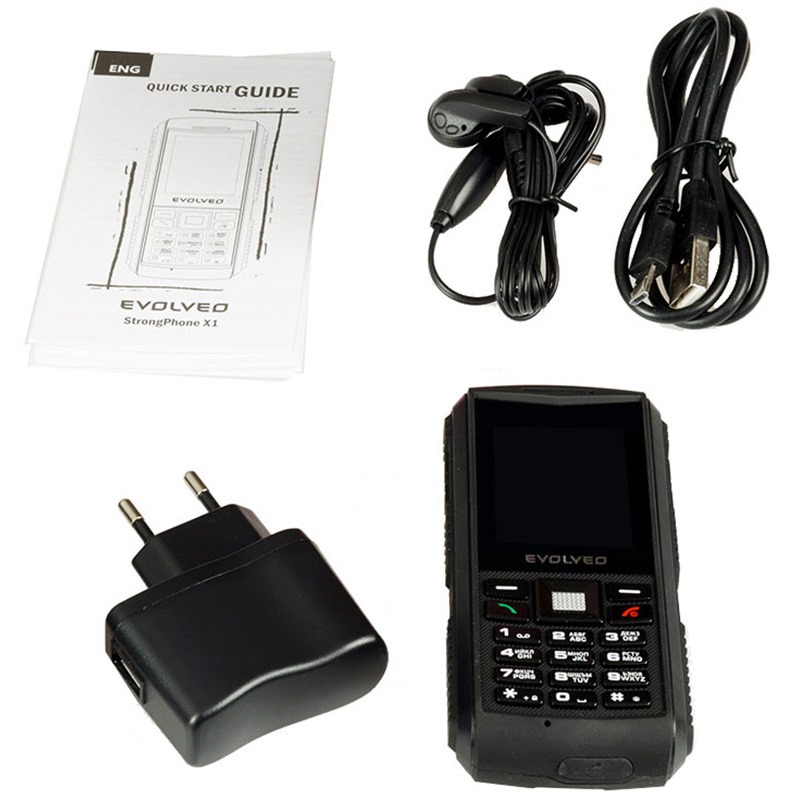 Z multimedálních funkcí je telefon vybaven digitálním fotoaparátem s rozlišením 2MPx a možností záznamu videa. Přístroj disponuje také širokou škálou předinstalovaných funkcí jako jsou FM rádio, LED diodová svítilna, MP3 přehrávač, video přehrávač, stopky, kalendář, digitální záznamník a jiné. EVOLVEO StrongPhone X1 standartně nabízí bezdrátové připojení bluetooth v3.0, datová spojení EDGE a GPRS Telefon lze využívat pouze s typem miniSIM karty. O celkovou výdrž přístroje se stará Li-Ion akumulátor o kapacitě 1 700mAh.