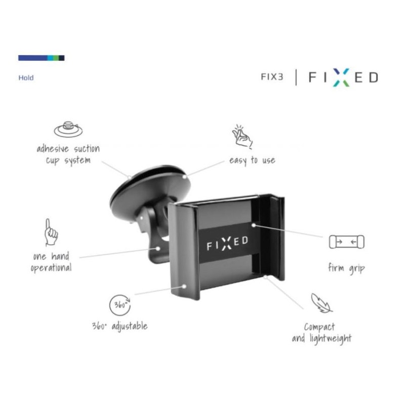 FIX3 je univerzální držák pro mobilní telefony do auta. Držák lze roztáhnout až do velikosti 90 mm. Minimální rozpětí je 60 mm. Přichycení je díky 8 cm dlouhému ramenu na sklo velmi snadné. Je možné jej díky adhezivnímu disku přichytit i na palubní desku. Úchyty jsou opatřeny jemným umělým potahem a tak je přístroj velmi pevně sevřen a zároveň mu nehrozí poškrábání. Jedná se o velmi chytře řešený držák.