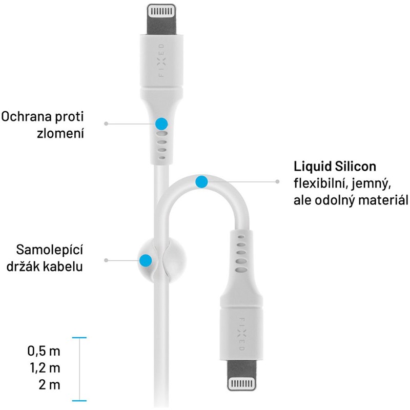 Datový a nabíjecí kabel FIXED Liquid Silicone v praktické prodloužené verzi s konektory USB-C a Lightning je ideálním doplňkem pro vaše Apple zařízení. Slouží pro nabíjení iPhonu nebo iPadu s Lightning konektorem maximální rychlostí, zároveň zvládá přenos hudby, fotografií a veškerých dat rychlostí 480 Mbps. Ochranný plášť kabelu je vyrobený ze speciálního materiálu s názvem Liquid Silicone. Díky tomu je kabel FIXED mnohem odolnější a ohebnější než běžné kabely, nezamotává se a je jemný na dotek. Bezchybnou spolupráci s Apple zařízeními zaručuje certifikace MFi (Made for iPhone / iPod / iPad). V balení najdete i praktické doplňky - stahovací pásek pro snadný transport kabelu a nalepovací organizér, kterým zafixujete kabel na zvoleném místě.