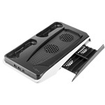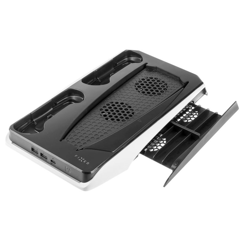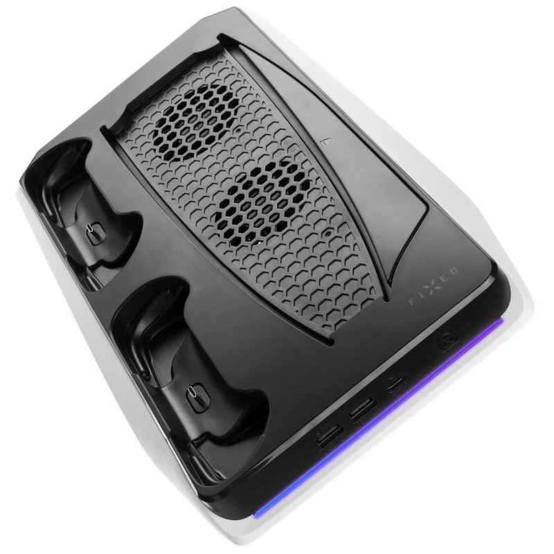 Multifunkční stanice FIXED v unikátním PS5 designu je idálním rozšířením pro vaši konzoli PlayStation 5, které oceníte při každodenním hraní. Představuje unikátní kombinací nabíječky pro dva ovladače DualSense konzole PS5, chladící podložky s dvojicí ventilátorů pro chlazení samotné konzole a držáku až pro 12 her na konzoli. Pro nabíjení ovladačů jsou připraveny dokovací kolébky s připravenými výyuvnými USB-C konektory. Stanice tak dokáže nabíjet oba DualSense ovladače současně bez nutnosti připojovat je ke přímo konzoli. Po každém hraní stačí ovladače zacvaknout do stanice a budou vždy plně nabité a připravené do další akce. Samotnou konzoli PS5 připojíte k doku pomocí USB-C kabelu. Při hraní můžete dotykovým ovládáním zapnout aktivní chlazení konzole pomocí ventilátorů multifunkční stanice. Chlazení je navíc doplněné efektivním modrým podsvícením. Samozřejmostí je ochana před přepětím, podpětím a další bezpečnostní prvky. Nabíjecí stanice FIXED je přizpůsobena pro klasickou i digitální verzi. Na boku pak naleznete skrytý výsuvný pořadač, který slouží pro uložení až pro 12 her. Pro připojení dalšího příslušenství (sluchátka, telefon apod.) jsou připraveny 2 klasické USB konektory.