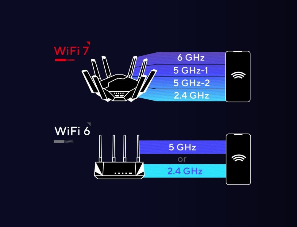 WiFi 7 (802.11be) je již sedmou generací standardu 802.11, který započal už v roce 1997. Nabízí všechny výhody moderních WiFi 6 a 6E a dále rozšiřuje několik stávajících věcí na nový level. Například 320MHz šířku kanálu v 6GHz frekvenčním pásmu (širší kanál pak umožní větší množství dat, které tam mohou současně proudit) a 4K-QAM (za stejný čas lze nyní stahovat a nebo uploadovat více dat). Přináší i nové funkce jako multi-link a MRU.V porovnání s předchozí a stále moderní WiFi 6 lze dosahovat teoreticky až 4.8x vyšších přenosových rychlostí a nižší latence. Než přišlo WiFi 7, přenosy byly omezeny pouze na jedno pásmo, např. 2.4 GHz a nebo 5GHz, díky MLO (multilink operation) se může koncové zařízení jako telefon, notebook nebo počítač s PCE WIFI 7 kartou připojit k více pásmům současně a využít tak plné spektrum šířky pásem. Aktuálně Asus nabízí 9 modelů základních desek s již integrovanou Wi-Fi 7 a další se v tomto roce představí.