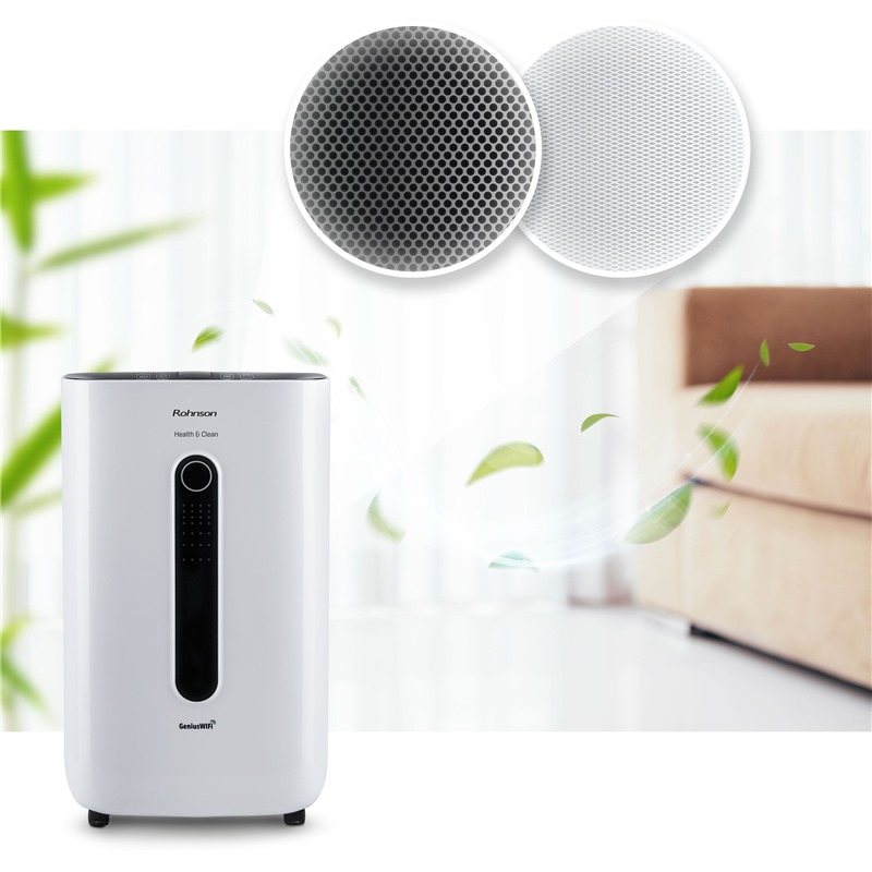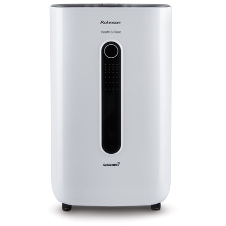 Zbavte se vlhkosti pomoci Rohnson R-9920 Genius Wi-Fi Health & Clean. Tento výkonný odvlhčovač je vhodný do prostor velikosti až o 120 m2. Dokáže odvlhčit až 20 l za den a kondenzát shromažďuje do nádoby o objemu 6,5 litrů. O naplnění nádoby vás informuje světelný indikátor. Mimo odvlhčování má tento přístroj také funkci ionizace. Uhlíkový filtr uvnitř zachytí spolehlivě i ty nejmenší částice.