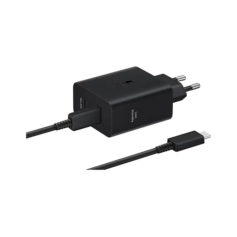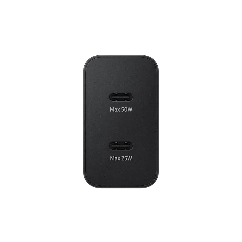 Samsung cestovní nabíječka do sítě s dvojicí USB-C výstupů a maximálním výkonem 50W (resp. 50W z horní zdířky a max. 25W ze spodní). Díky podpoře rychlého nabíjení dokáže svižně dobít vaše zařízení a vy tak nemusíte ztrácet čas. Disponuje distribucí nabíjecího proudu a napětí Power Delivery, která umožní vybrat vždy ten nejvhodnější nabíjecí proud a napětí přímo pro vaše zařízení.