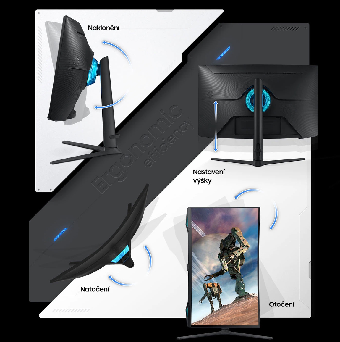 Dosáhněte výherních výšin. Otočte, nakloňte a výškově upravte monitor tak, abyste měli perfektní výhled na všechny nepřátele. Plná kompatibilita se standardem VESA vám rovněž umožní připevnit monitor na rameno nebo třeba zavěsit na zeď. Všechny připojovací porty jsou pak velice jednoduše dostupné, takže k monitoru budete moci připojit rozličná zařízení, a vše bude vypadat maximálně elegantně.