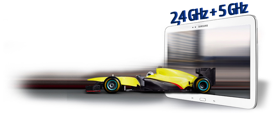 Tablet GALAXY Tab 3 (10,1") podporuje kanály 2,4 GHz a 5 GHz a dvojnásobnou rychlost přenosu dat (143 Mb/s), díky čemuž vám poskytuje prostředí pro rychlejší sdílení obsahu.