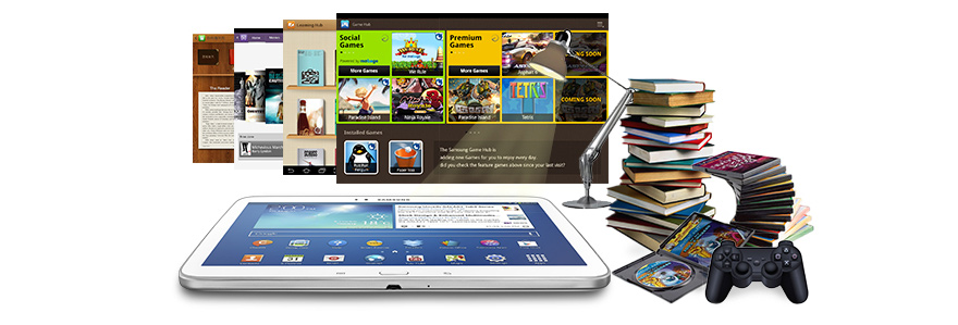 Bez ohledu na to, zda odpočíváte na pohovce, hrajete si v dětském koutku nebo čtete elektronické knihy svým dětem v posteli, budete si moci užívat podnětný svět digitálního obsahu plný zábavy a bezstarostného sdílení. Kupujte nebo si půjčujte filmy ve službě Video Hub, vašem osobním správci videoobsahu. Díky funkci progresivního stahování prakticky nebudete muset čekat a budete se moci dívat na některý z více než 1.000 titulů již během stahování. Vyhledávejte, přehrávejte ukázky a nakupujte skladby ve službě Music Hub. K dispozici je vám ohromující zásoba více než 13 milionů skladeb, které můžete intuitivně přehrávat a ukládat. Game Hub, váš jedinečný zdroj prémiových her a her pro více hráčů, vám umožňuje kdykoli se ponořit do akce, ať jste kdekoli.
