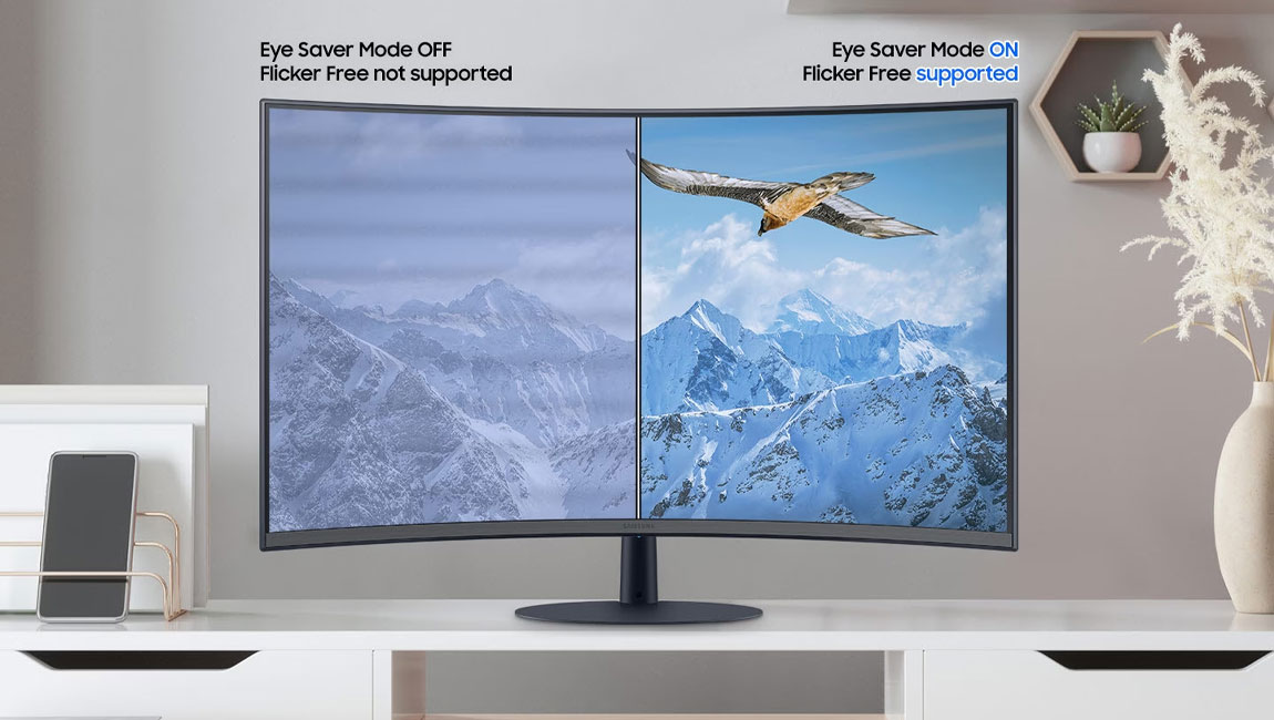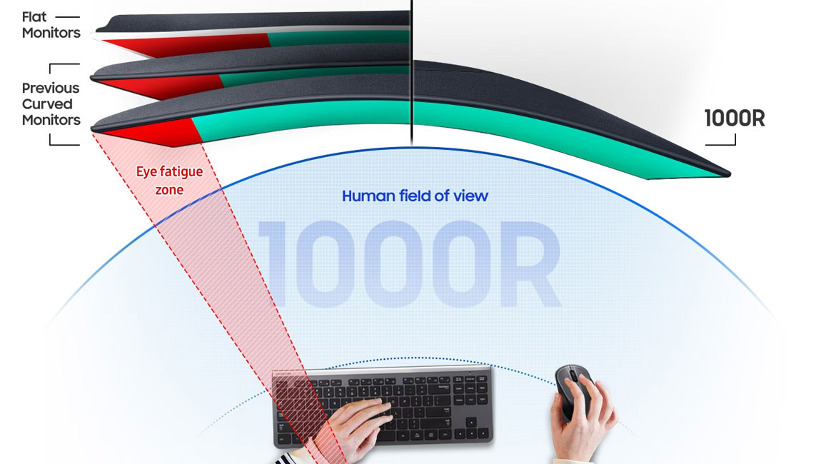 Co odlišuje běžné obrazovky od prohnutého monitoru Samsung? Především hodnota zakřivení. Displej Samsung nabízí hodnotu 1000R, která se přibližuje zornému poli člověka, čímž minimalizuje namáhání zraku. Klinická studie provedená národní univerzitní nemocnicí v Soulu prokazuje, že čím více se poloměr zakřivení blíží hodnotě 1000R, tím méně jsou oči namáhány.