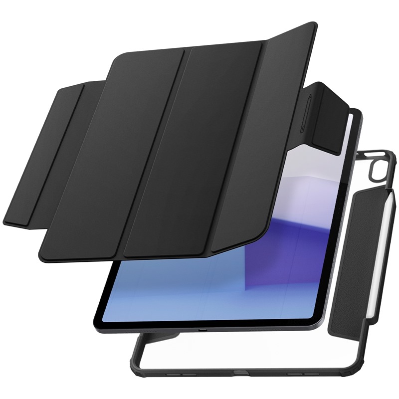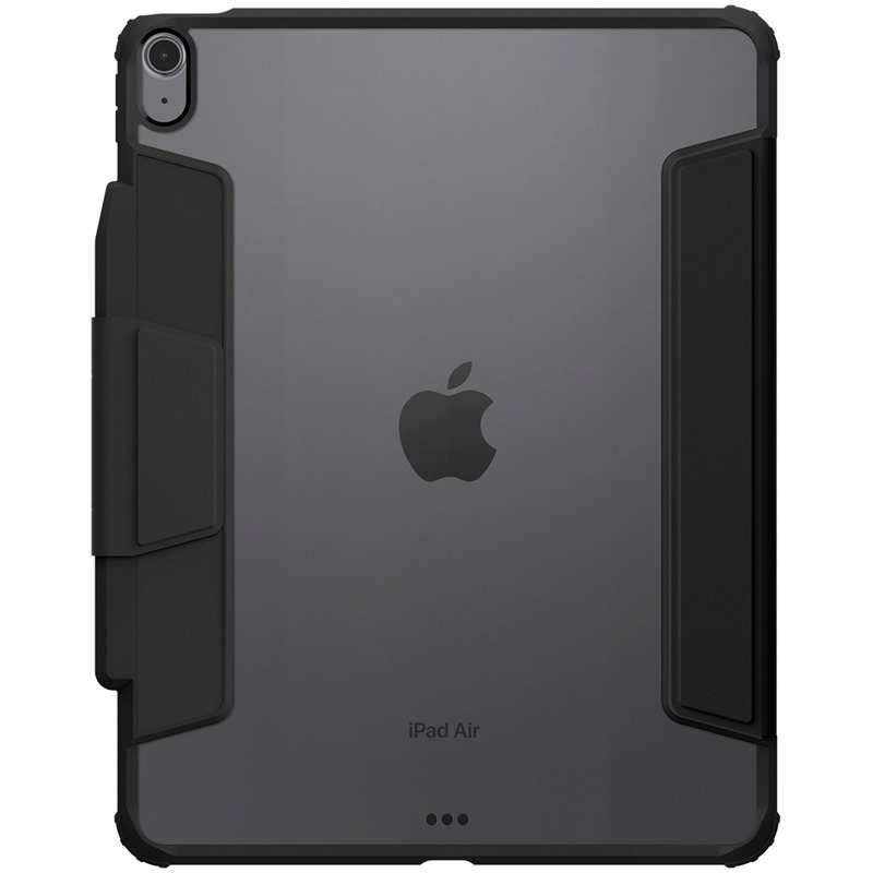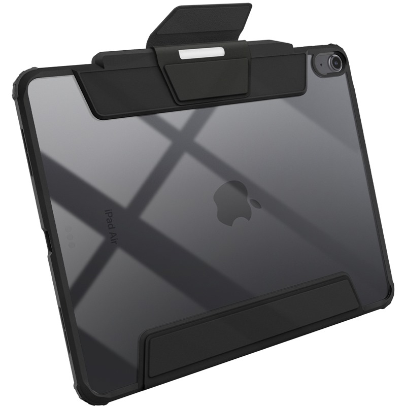 Silou magnetů drženou přední stranu lze využít jako polohovatelného stojánku ve dvou úhlech a lze ji navíc úplně odejmout a mít iPad zabalený pouze v průhledném krytu.