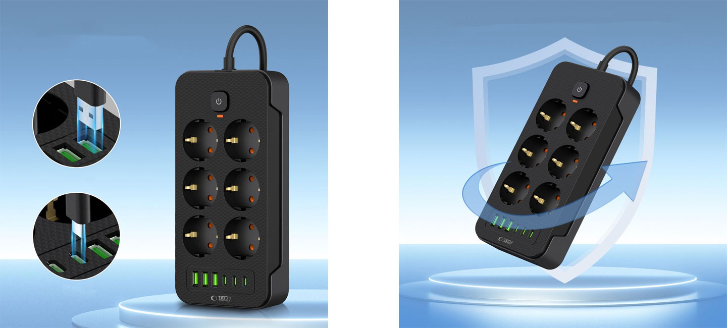 Hledáte spolehlivou a praktickou prodlužovací lištu, která umožňuje připojit a nabíjet více zařízení najednou? Tech-Protect PC6X6 je skvělou volbou pro váš domov nebo kancelář. Tento multifunkční prodlužovací přívod je vybaven šesti síťovými zásuvkami, třemi USB-A porty a třemi USB-C porty, což zajišťuje, že můžete připojit až 12 zařízení najednou. Díky kompaktním rozměrům a modernímu designu se tento produkt skvěle hodí k jakémukoliv interiéru.