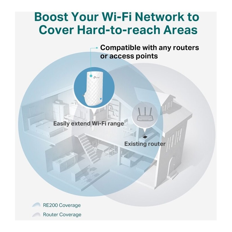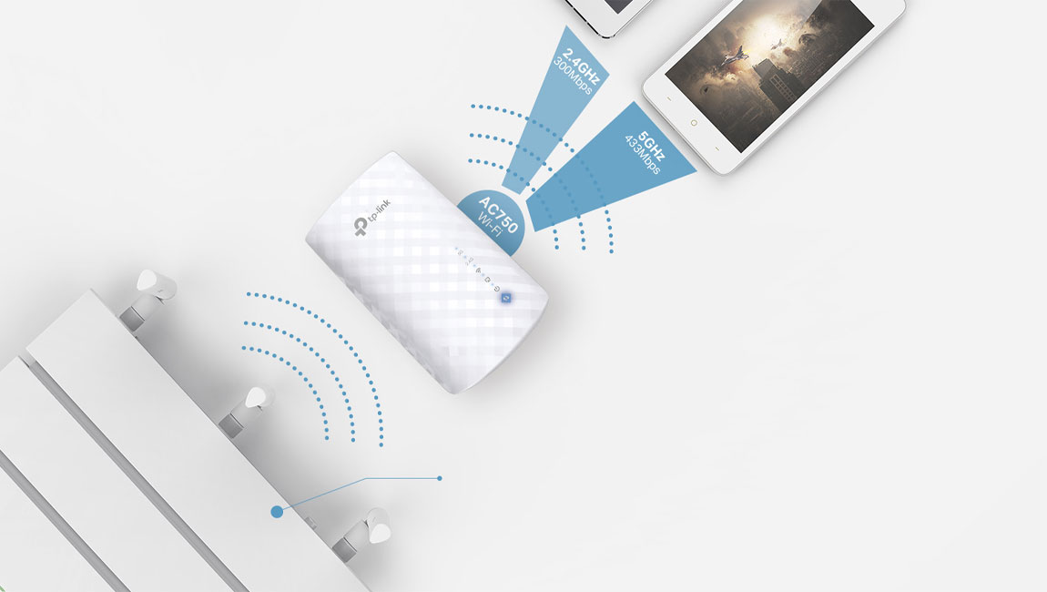 Umístěte extender RE190 mezi bezdrátový router a bezdrátová zařízení a rozšiřte pokrytí Wi-Fi sítě vykrytím mrtvých zón. Vychutnejte si bezproblémovou bezdrátovou síť v domácnosti nebo kanceláři. Podpora duálního pásma Wi-Fi s rychlostí až 750 Mb/s pomáhá nejen rozšířit pokrytí plochy do velikosti 185 m2, ale také dobře využít vysokou rychlost vašeho ISP - ideální pro streamování videa ve vysokém rozlišení, online hraní a další úlohy náročné na šířku pásma.
