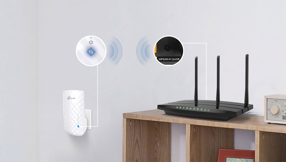 Stiskněte tlačítko WPS na vašem routeru a tlačítko RE na zařízení RE190 během 2 minut od zapojení, abyste se mohli snadno připojit k síti. Po připojení k existujícímu routeru můžete zařízení RE190 jednoduše přemístit na libovolné místo, aby byla zajištěna nejlepší síla signálu. Inteligentní signální kontrolky indikují sílu signálu přijatou ze stávajícího routeru. Sledujte rozsvícení kontrolek pro vyhledání toho nejlepšího místa pro svůj RE190.