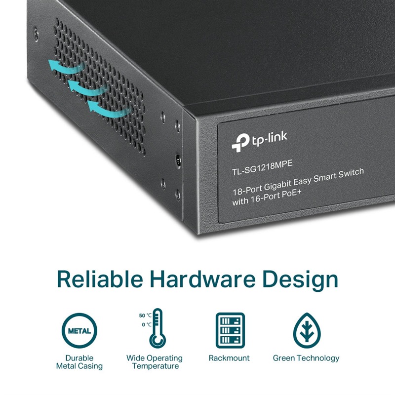 Odolné kovové pouzdro a profesionální konstrukce odvodu tepla zajišťují spolehlivé používání v širokém rozsahu provozních teplot (0–50 °C). TL-SG1218MPE je plně kompatibilní se zařízeními PoE, jako jsou IP kamery, přístupové body a IP telefony. Lze také použít s kabelovými zařízeními bez PoE k zajištění gigabitových připojení pro zařízení, jako jsou počítače, tiskárny a IPTV.