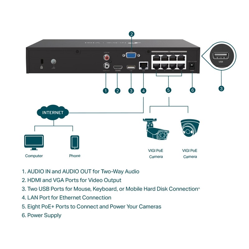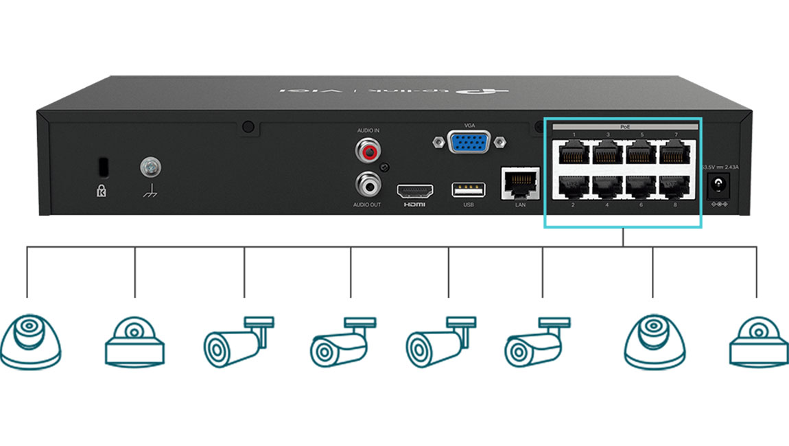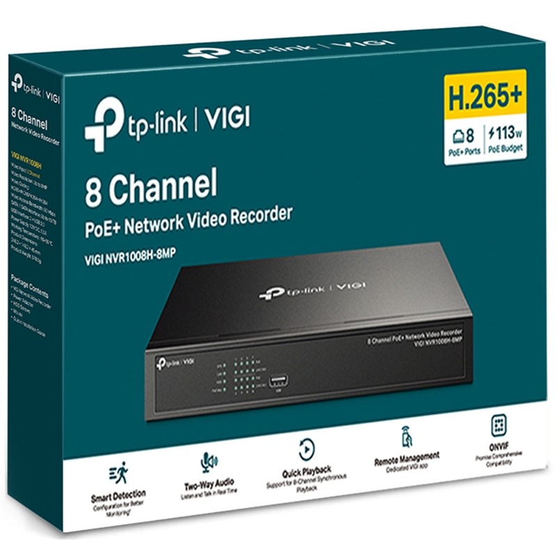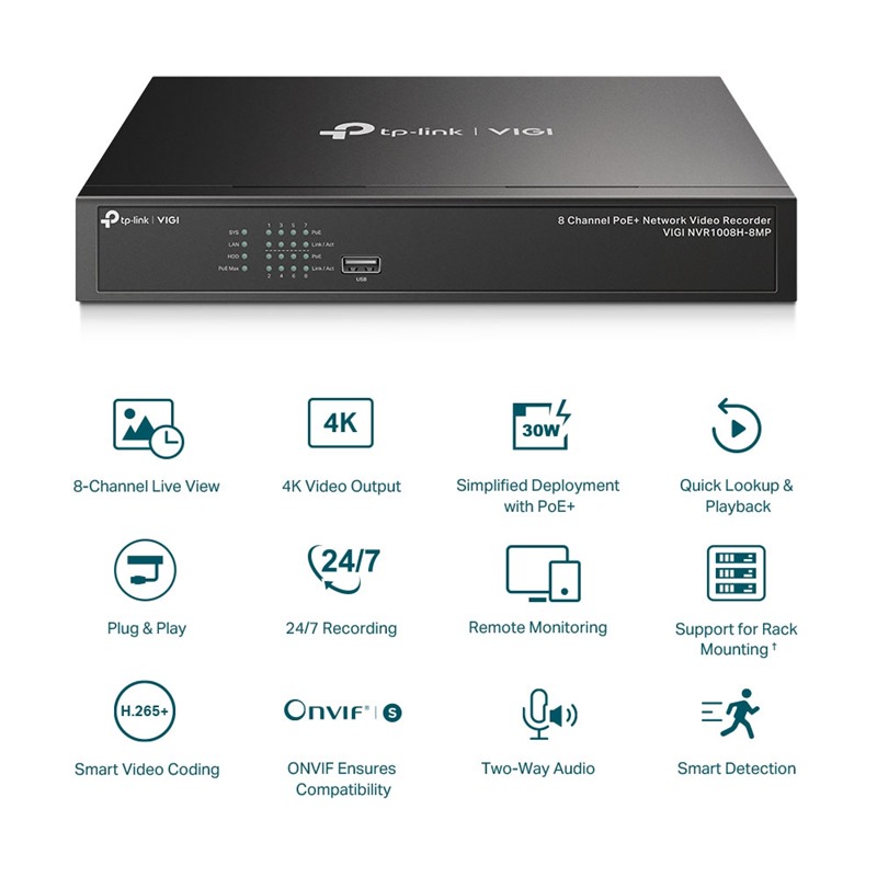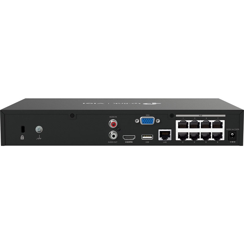 Nabízí 8× 10/100 Mbps PoE+ porty, NVR podporuje až 30 W na každém PoE+ portu. Je navržen pro použití jediného ethernetového kabelu pro přenos dat i napájení a nabízí flexibilní instalaci, která se hodí do různých scénářů dohledu pro malé podniky, jako jsou prodejny, sklady, restaurace a penziony.