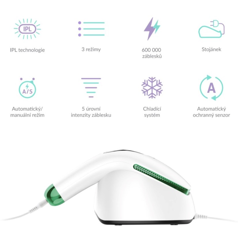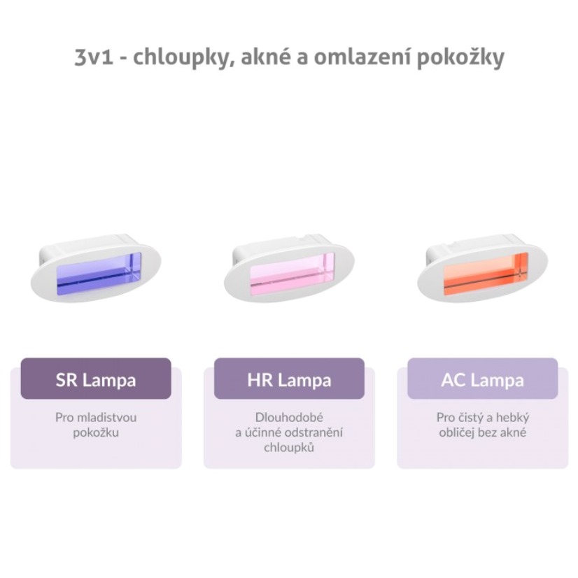 Epilátor TrueLife BELLE IPL E5 využijete kromě samotné epilace i k dalším aplikacím. Stačí pouze vyměnit lampu. K dlouhodobému a účinnému odstranění chloupků vám poslouží HR lampa, Nejednoho člověka trápí akné. Pokud chce mít obličej čistý a hebký na dotek, doporučujeme použít AC lampu. Pokud chcete svoji pokožku omladit, pomůže vám s tím SR lampa. Všechny lampy jsou součástí balení. Nemusíte si tedy nic dokupovat. Určitě oceníte i praktický stojánek.